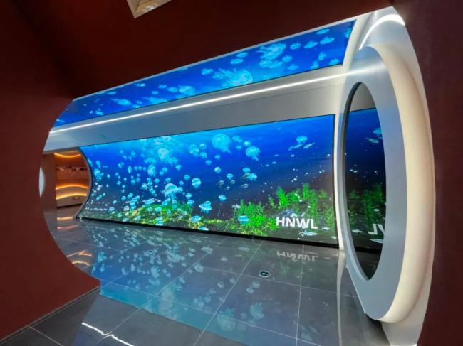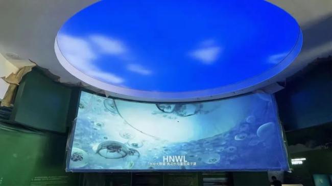显屏区域多以异形屏展示为主,相对于传统的固装屏而言,异形屏赋予了它更多的“灵性 ”。跟随着参观动线的游走,聆听着专业团队的讲解,辅以LED异形屏的显示效果,“梁子湖水的浪漫,生态文明的奥秘”逐步呈现。